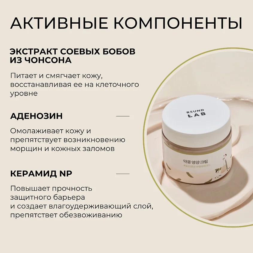 - Round Lab soybean cream — питание и восстановление благодаря экстракту сои.